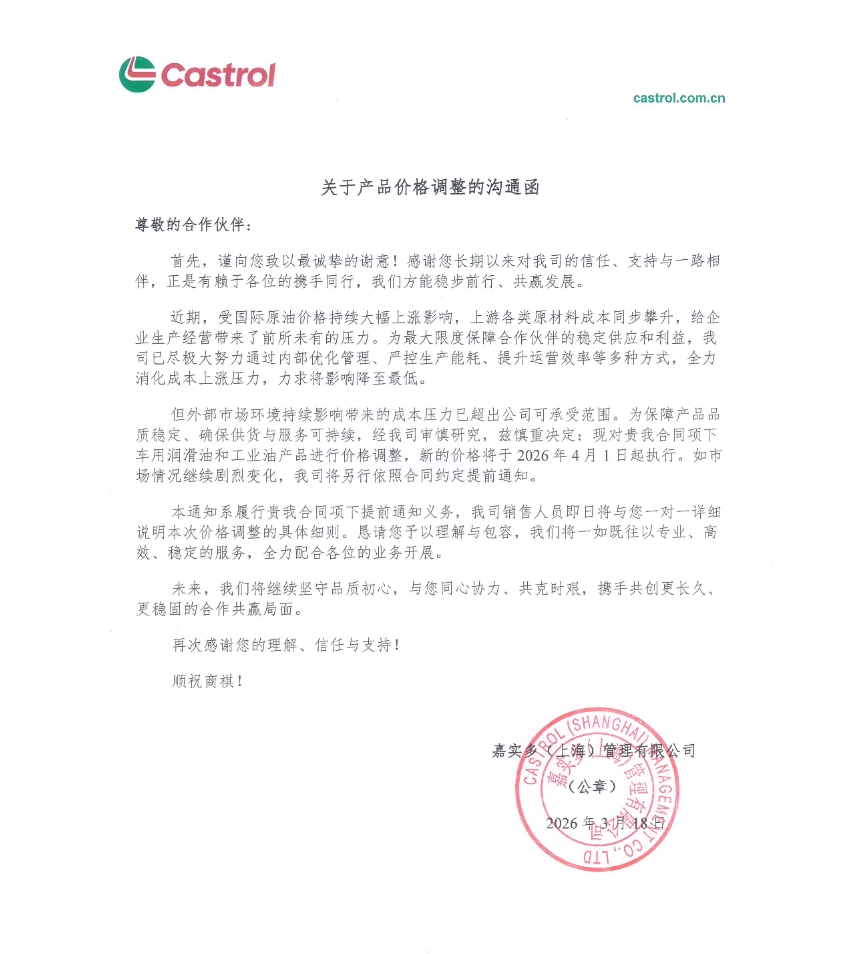 据嘉实多 2026 年 3 月 18 日沟通函,受国际原油及原材料成本大幅上涨影响,其车用润滑油和工业油产品自 2026 年 4 月 1 日起调价。我司将同步具体细则,请提前做好成本管控与备货规划。具体通知如下:
