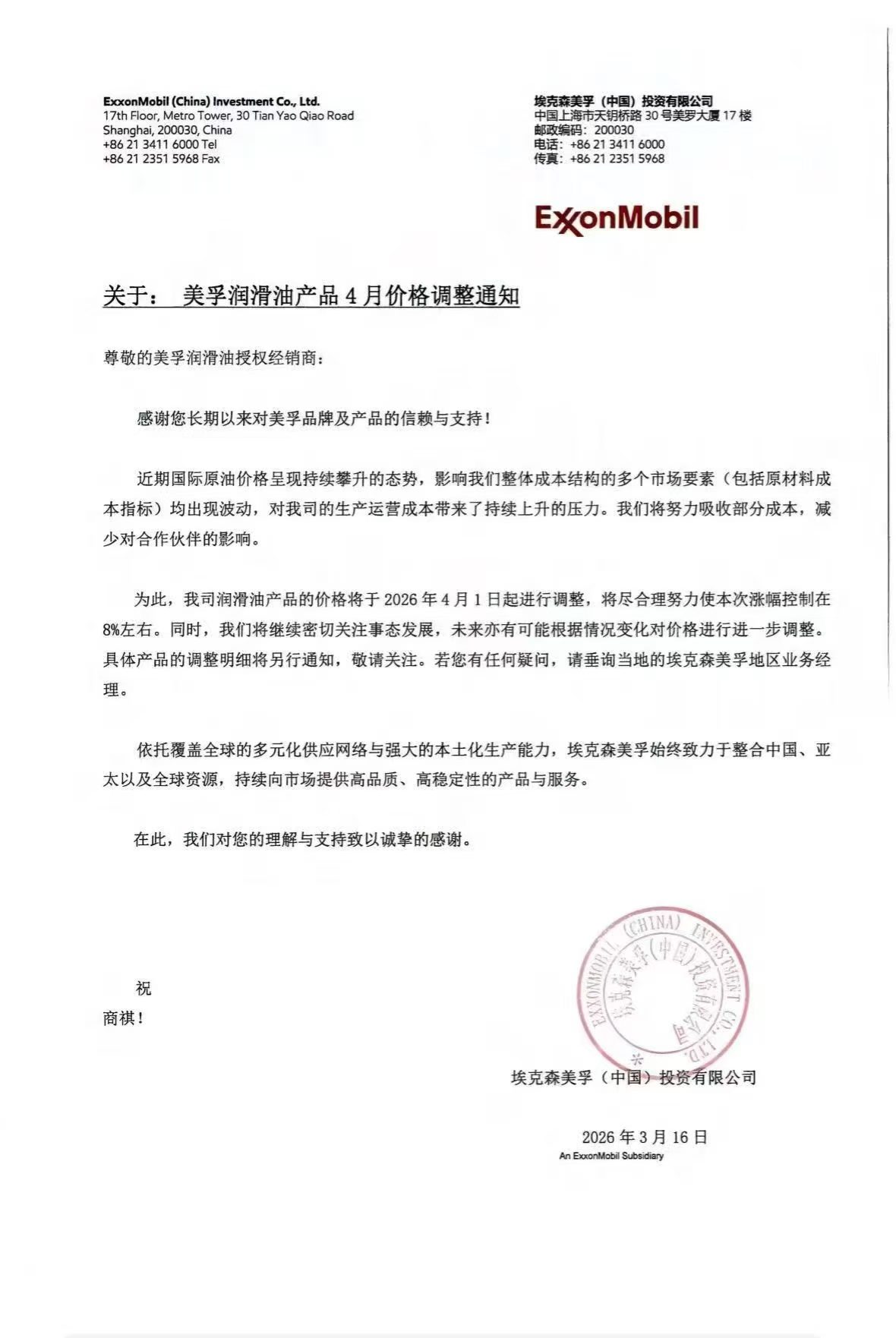 据埃克森美孚 2026 年 3 月 16 日通知,受国际原油价格攀升影响,其润滑油产品自 2026 年 4 月 1 日起调价,涨幅控制在8% 左右,后续或有进一步调整。我司将同步明细,请提前做好成本与备货规划。具体通知如下: