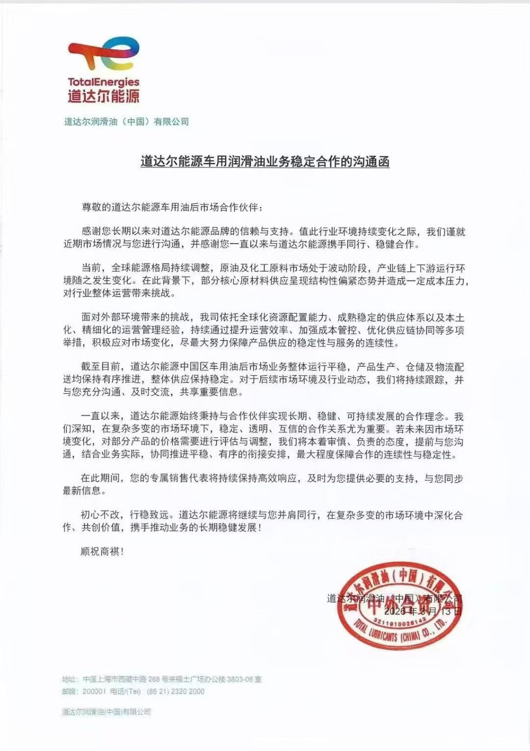 据道达尔能源 2026 年 3 月 13 日沟通函,受全球能源及原材料波动影响,核心原材料偏紧、成本承压,或对部分产品价格进行评估调整。目前供应稳定,我司将持续跟进价格动态,请提前做好备货与成本规划。具体通知如下: