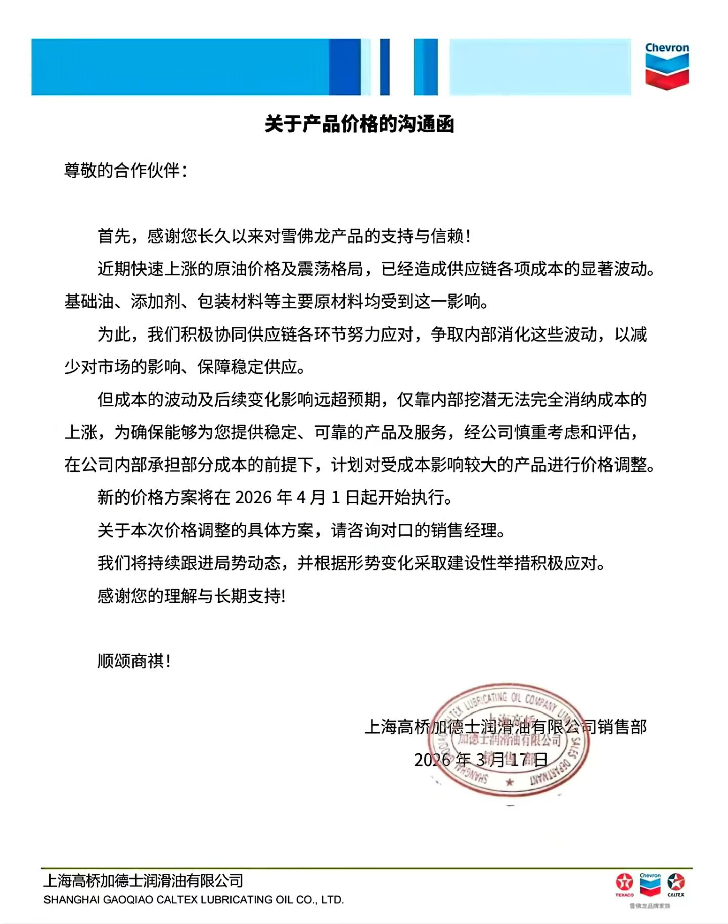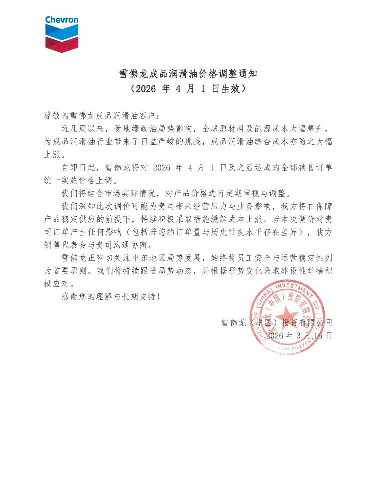 据雪佛龙(中国)2026 年 3 月 16 日通知,受地缘政治及全球原材料、能源成本攀升影响,其成品润滑油自 2026 年 4 月 1 日起统一上调价格。我司将持续跟进价格动态,请提前做好成本管控与备货规划。具体通知如下: